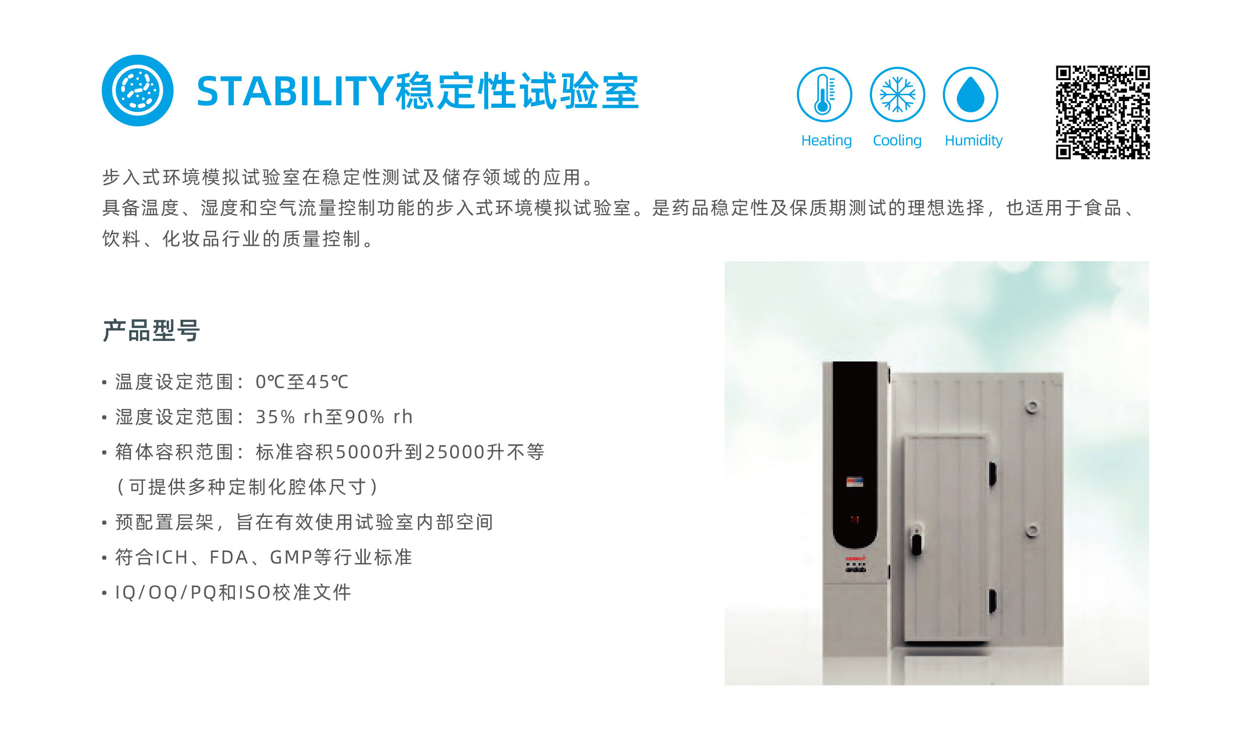 美墨尔特-艾瑞莱博步入式稳定性试验室STABILITY为您保驾护航! 为满足药品稳定性测试及受控环境下的存储需求,美墨尔特-艾瑞莱博步入式稳定性试验室STABILITY能为您提供精准的温湿度均一性,强大的数据监测功能,并严格遵循ICH指南。我们步入式试验室模块化的设计,可灵活适应您试验室现有的空间布局与未来发展规划。通过选配的前置缓冲室,可确保试验核心区域始终处于理想的温湿度条件。以无可比拟的安全性及合规性,为药品及试样提供全方位保护。 因为我们深知,在制药领域,每一度都至关重要!